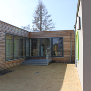 wurde in Holzständerbauweise errichtet. Mit einer witterungsfesten Holzverschalung steht er als optisch „warme“ Ergänzung | ||||||