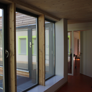 Der Anbau schließt mit einem Licht durchfluteten Spielflur an das bestehende Gebäude an. In diesem Bereich besteht die | ||||||