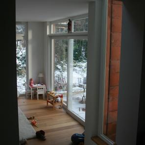 kupferblechverkleideter Anbau in Holzständerbauweise mittels einer Glasfuge an den Bestandsbau angefügt, um eine |